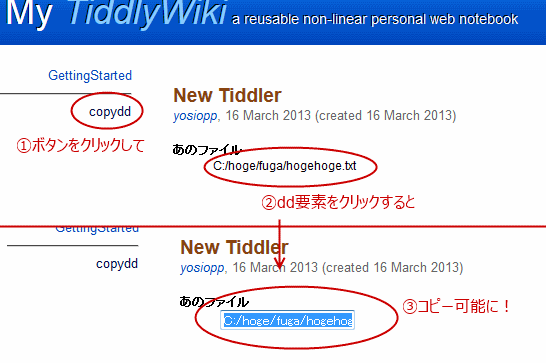 すると、[copydd]ってボタンがtiddlerの該当箇所に出現するので、それをクリック。